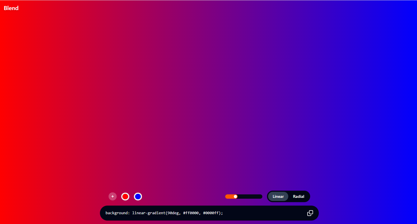「Linear(線形)」と「Radial(放射状)」の2種類のグラデーション形式に対応。色を選び、位置を調整するだけで background プロパティのCSSコードが生成されます。