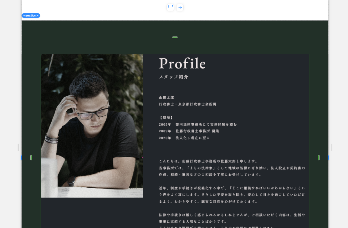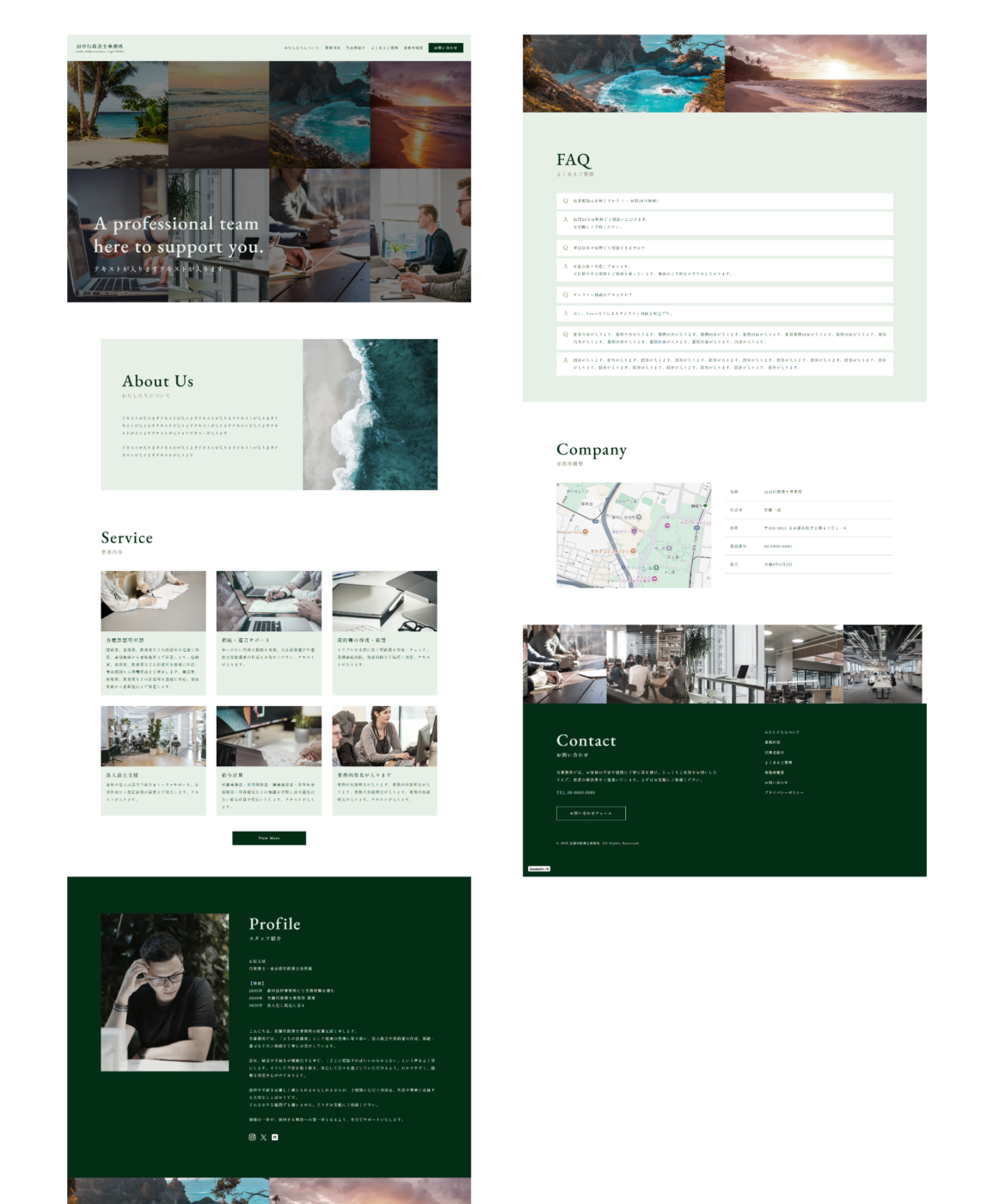 深緑でまとめたイメージ。バックグラウンドカラーを#e7f0e7、ネイビーカラーを#042d16に変更。
