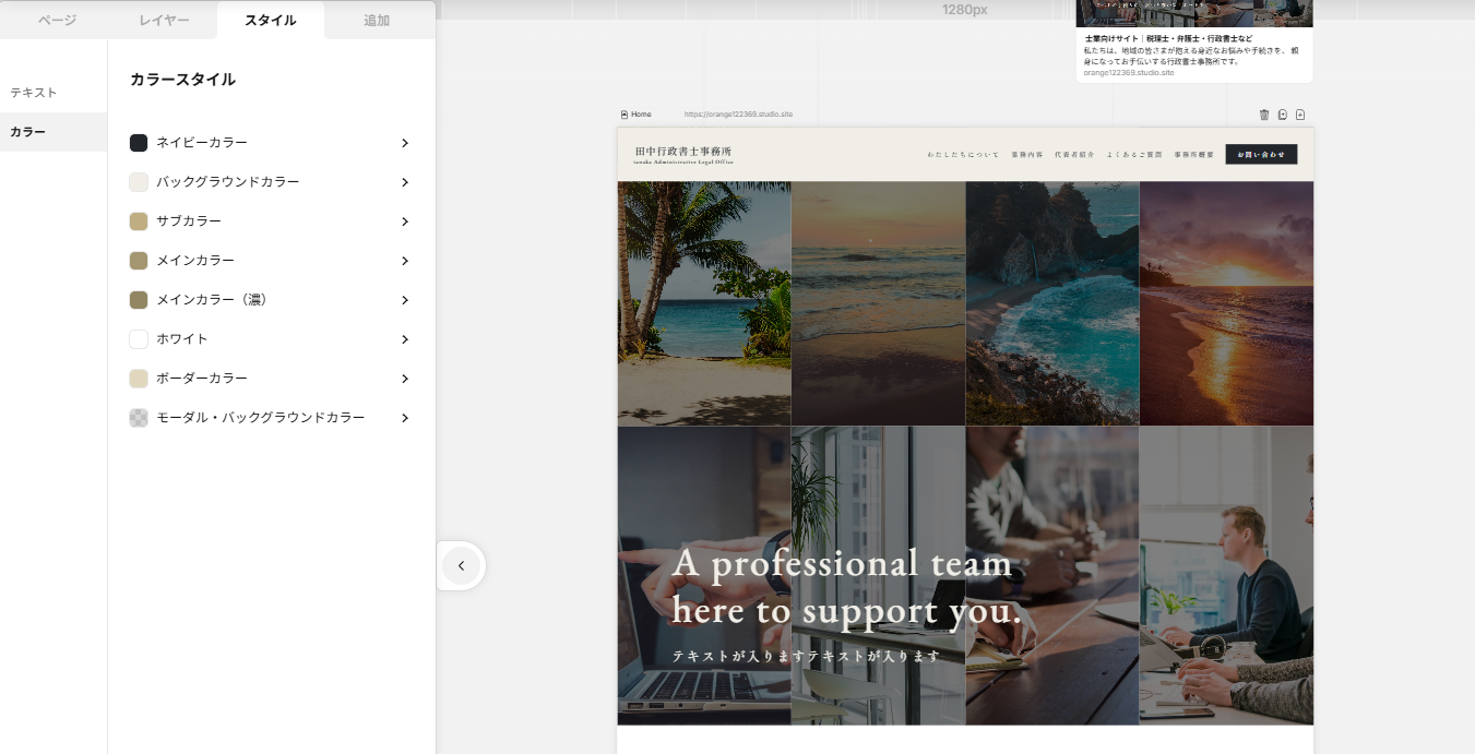 「士業向けサイト|シンプルモダン」テンプレート内で使用しているカラーはすべて「カラースタイル」に登録されており一括変更が可能です。テンプレートカラーを自分仕様にカスタマイズしたい場合、一括変更を行うことで作業時間を短縮することができます。