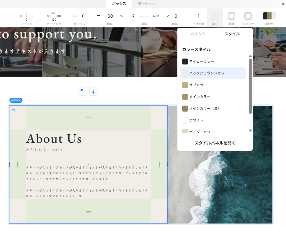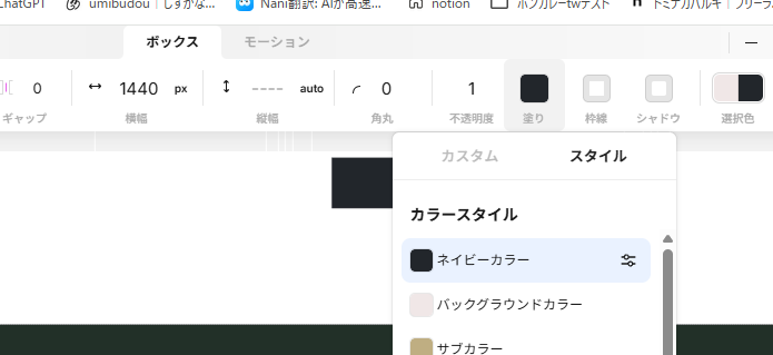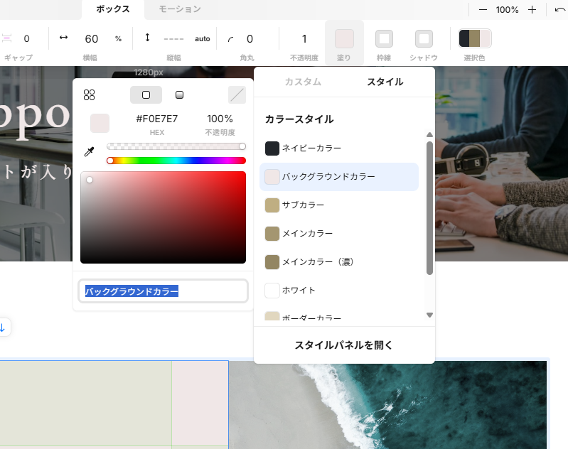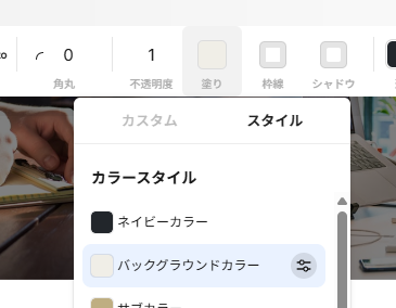 ベージュ背景部分を選択し上の「塗り」にカーソルを合わせます。