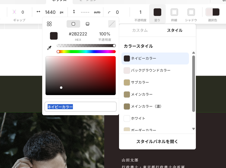 左パネルの「スタイル」>「カラー」で登録されているカラーがわかります。ただしこの場所からは変更することはできません。