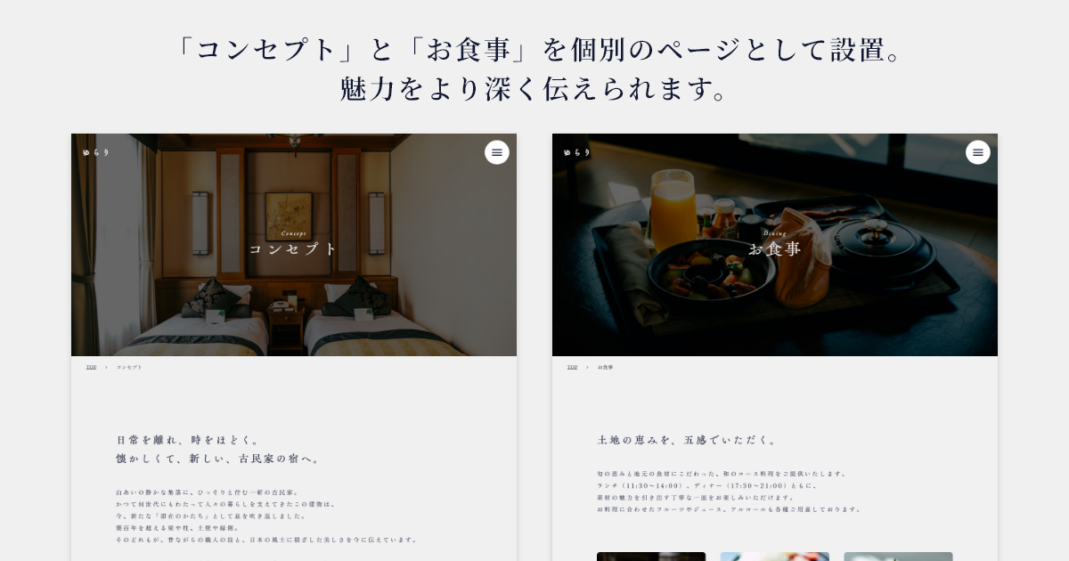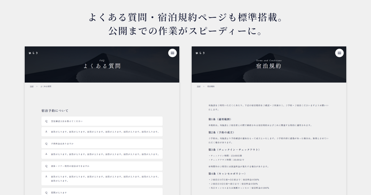 古民家、コテージ、ヴィラ、民泊などに共通して必要なページを揃えています。