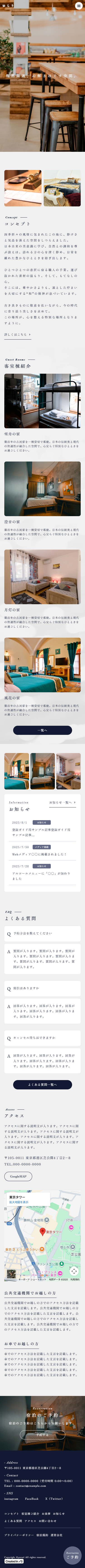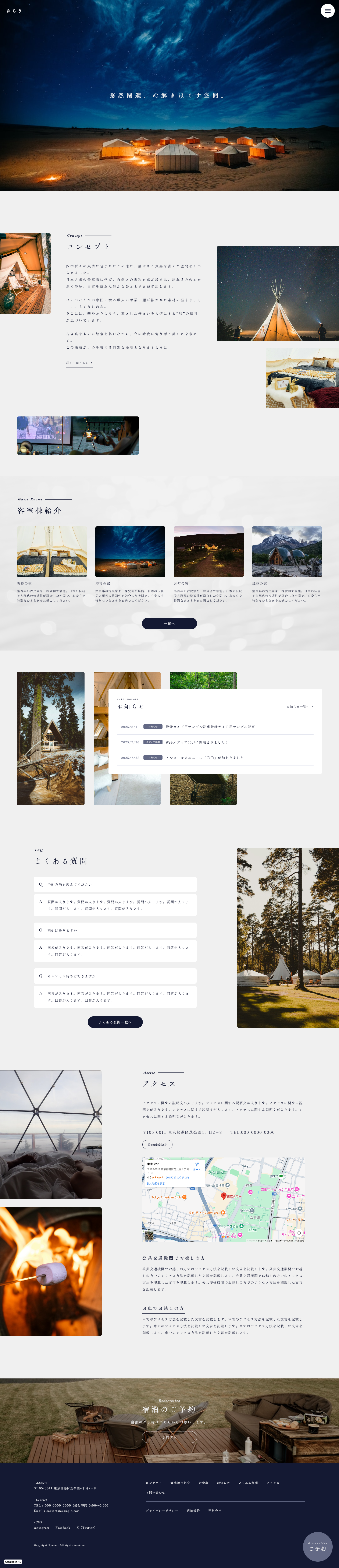 Studioテンプレート「古民家・ヴィラ|宿泊施設」は、写真のトーンや見せ方を少し変えるだけで、グランピング・ゲストハウス・民泊・ヴィラなど、幅広い宿泊形態に対応できる柔軟さがあります。ぜひご利用ください。